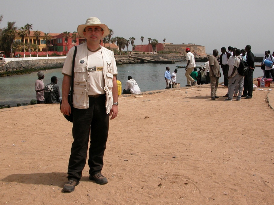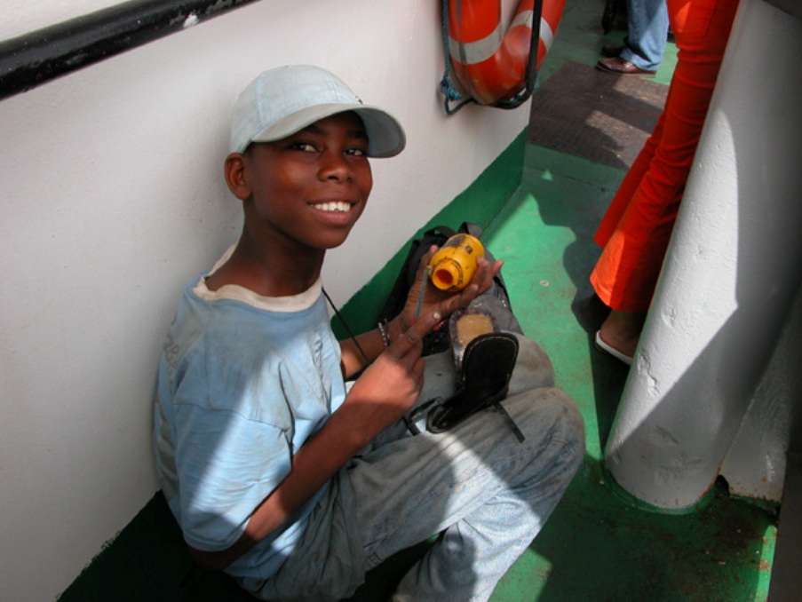 Compañera inseparable en todos mis viajes, mi esposa Elvira y yo esperábamos en el puerto de Dakar nuestro turno de embarque, junto a una muchedumbre animosa que se preparaba para pasar en la isla una ociosa mañana de domingo. Una vieja chaloupe sobrecargada nos trasladaría a nuestro destino surcando las aguas color turquesa del Atlántico. Mientras nos agolpábamos con el gentío que subía a bordo, un chaval espabilado nos hizo señas para que le siguiéramos por una puerta lateral que evitaba las aglomeraciones. Fue el primer amigo que hicimos. Se llamaba Mamadou y a sus escasos doce años ya era un experto zapatero que, ataviado con una pequeña lata de herramientas que llevaba a todas partes, empleaba sus habilidades para ganarse dignamente la vida. Después de pugnar con los pasajeros para instalamos en un rincón en la cubierta, Mamadou se esforzó en demostrarnos su buen hacer cosiendo y pegando sus propias sandalias, mil veces remendadas, mostrándolas satisfecho ante mi cámara de fotos. Su sonrisa permanente y sus ojos siempre iluminados, ajenos a su humilde condición, se convertirían en uno de los recuerdos más intensos que conservo de aquel día.