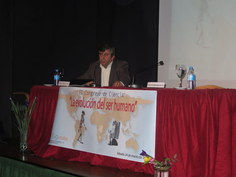 Las ponencias de la segunda parte del congreso que se ha realizado durante la tarde, ha estado a cargo de Antonio Martínez Única, filósofo y divulgador científico y del Dr. Manuel Ruiz Torres, biólogo. La primera de ellas titulada “La evolución humana según la Filosofía de Oriente” recorrió las teorías de occidente sobre la evolución de los homínidos, y luego presentó la visión de las antiguas filosofías de Oriente, en relación al ser humano y su desarrollo como especie e individuo. Para cerrar el congreso, el Dr. Ruiz Torres bajo el título “Nuestro lugar natural: ser más humanos”, propuso recuperar el lugar natural que nos corresponde en el medio ambiente para dejar de ser una especie implacablemente depredadora, y aprender a desarrollar nuestra existencia, integrándonos en los ecosistemas del planeta.