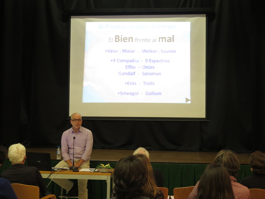 Charla-coloquio Ponente: Antonio Lozano Ha tenido lugar la tercera charla coloquio del Ciclo “El viaje del Héroe” en el Auditorio Marvá, 16 del Centro Imaginalia a cargo de Antonio Lozano, quien nos ha llevado magistralmente de la mano de un héroe por casi todos conocidos, Frodo. Este héroe es portador de profundas dimensiones que apenas se pueden vislumbrar si no se hace una lectura ahondando en los mitos milenarios de los que Tolkien, el autor del Señor de los Anillos, era un erudito. Luego de acercarnos a la excepcional biografía de Tolkien, la charla se zambulló en la simbología del viaje de Frodo, que es un viaje por el interior del ser humano. Se nos reveló la secuencia de las etapas que se cumplen en el viaje del héroe cada vez que se escribe una novela o se rueda un film y que han sido perfectamente descriptas por Joseph Campbell, el gran estudioso de los mitos. La charla coloquio estuvo amenizada con la proyección de varias secuencias de la película homónima que ha conseguido reflejar el espíritu de la obra literaria. Antonio, considera al Señor de los Anillos, un libro alquímico, de aquellos que transforman al lector y lo animan a ser mejor persona. Sin duda una invitación para leer, o releer una vez más, esta magnífica obra que consigue despertar los más nobles sentimientos del lector. Esta conferencia se realizó el jueves 17 de noviembre de 2016 a las 20:15 horas