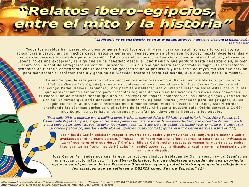 Viernes 24 de diciembre de 2013 a las 20:00 horas Exposición Relatos ibero-egipcios. Entre el mito y la historia “La Historia no es una ciencia, es un arte; en sus aciertos interviene siempre la imaginación” Anatole France (Premio Nobel de Literatura en 1921) Todos los pueblos han perseguido unos orígenes históricos que sirvieran para construir su espíritu colectivo, su idiosincrasia particular. En muchos casos, estos orígenes son reales; pero en otros son ficticios, mezclándose leyendas y mitos con sucesos inventados para la ocasión. Esto no es algo nuevo, es tan viejo como la misma historia; el caso de España no es una excepción, es algo que se ha generado desde la Edad Media y que perdura hasta nuestros días, si bien ahora con un sentido antagónico en vez de unificador… Es curioso que hasta bien entrado el siglo XIX los tratados generales de Historia comenzaran con la descripción geográfica de la península y una serie de reyes míticos que servían para manifestar el carácter propio y genuino de “España” frente al resto del mundo, que a su vez, hacía lo mismo. La visión que de este pasado mítico recogen historiadores como el Padre Juan de Mariana (en su obra Historia General de España), o autores contemporáneos como el escritor Jose Carlos Fernández o el arqueólogo Rafael Ramos Fernández, nos permite establecer una quimérica relación entre estas dos culturas, que aprovechamos libremente para presentar algunas de sus manifestaciones artísticas más conocidas. El Padre Juan de Mariana señala que uno de los reyes de España nombrado en los libros griegos y latinos fue Gerión, un tirano que sería depuesto por el primer rey egipcio, Osiris (Dyonisios para los griegos), quien según cuenta el autor, había recorrido medio mundo desde Etiopia pasando por India, Asia y Europa enseñando las técnicas agrícolas y el cultivo de la viña. Al llegar a nuestro país, Osiris derrotó a Gerión movido por su odio hacia los tiranos y su afán por devolver la libertad a los pueblos. “Emprendió Ofiris al principio una grandifima peregrinación,… comenzó defde la Ethiopia, y pafó hafta la India, Afia y Europa. (…) Últimamente llegado á Efpaña, lo que en las demás partes executara no por particular provecho fuyo, fino encendido del odio que á la tyrania tenia y á las demafias, que fue quitar los tyranos y reftituir la libertad á las gentes, determinó hacer lo mifmo en Efpaña… (…) La victoria y el campo, muertos y deftruidos los Efpañoles, quedó por los Egypcios: el mifmo Gerion murió en la batalla…” Los hijos de Gerión quisieron vengar la muerte de su padre y promovieron una conjura para matar a Osiris, ayudados por el hermano de éste, “Typhon”… El Padre Mariana refiere además la existencia de “Hércules el Libyo” que no es otro que Horus (“Oro”), el hijo de Osiris, quien después de vengar la muerte de su padre, hizo levantar las “columnas de Hércules” y nombró gobernador a Híspalo, el cual reinó en la Península y dió nombre a Híspalis. |