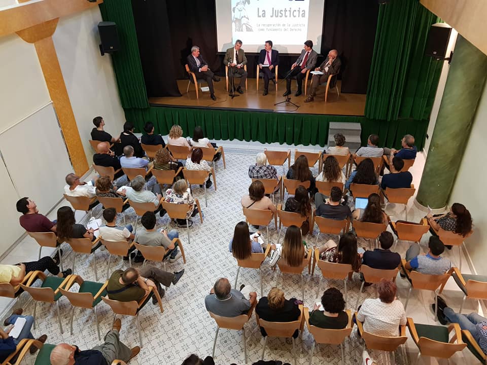 Viernes 18 de mayo de 2018 a las 20:15 horas Mesa redonda La recuperación de la justicia como fundamento del Derecho El evento ha contado con la participación de cuatro ponentes de amplia y reconocida trayectoria en el mundo jurídico. D. Juan Manuel de Faramiñán, Catedrático de Derecho Internacional, D. Santiago González-Varas, Catedrático de Derecho administrativo de la Universidad de Alicante, D. Francisco Capacete, Abogado especialista en Derecho Animal y D. Lisardo García, Miembro de la Unión de Abogados Europeos han sido presentados por D. Juan Adrada, Director del Centro Imaginalia, quien ha hecho su función de moderador en el debate. Los currículos de los ponentes están detallados en el siguiente enlace: https://www.centroimaginalia.org/la-recuperacion-de-la-justicia-como-fundamento-del-derecho/ El debate se ha iniciado con la pregunta troncal ¿Qué es la Justicia? ¿Qué relación tiene con el Derecho? Casi todos los ponentes se han referido a las ideas planteadas por los grandes filósofos en relación con el concepto de Justicia, como Platón, Aristóteles, Séneca, entre otros. Y se ha entendido al Derecho como una aplicación de la idea arquetípica de justicia, en la práctica con todas las dificultades que tal actividad humana conlleva por el mero hecho de ser, obviamente, realizada por seres humanos con las limitaciones propias de su naturaleza. Todos coincidieron en que la aplicación de la justicia necesita de la sabiduría y compromiso de las partes involucradas, y también destacaron la peligrosidad de los juicios paralelos que se realizan a nivel mediático y social de los casos más notorios. Ya que éstos, no tienen los elementos necesarios para juzgar desde el ámbito externo. Aunque se ha expresado también la conveniencia de que los jueces sean sensibles a la realidad social para el mejor desempeño de su función, siempre que mantengan su independencia de cara a presiones mediáticas. La ética es la mejor amiga de la justicia, y en tanto se eduque a los individuos en valores éticos harán falta menos leyes y regulaciones. El público, constituido en parte por estudiantes universitarios de derecho, ha seguido atentamente las ponencias y al final de las mismas se ha realizado un turno de preguntas a los ponentes.