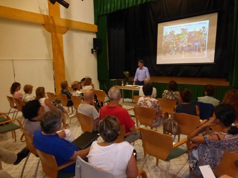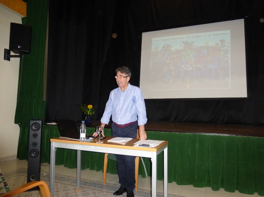 Ciclo El viaje del Héroe "Superhéroes del cómic, el deber y el dilema" Charla-coloquio Ponente: Vicente Penalva En la conferencia, se ha expuesto sobre la capacidad de descubrir aquel potencial que está presente en cada ser humano, se ha planteado el despertar del héroe que llevamos dentro, para poder vencerse a sí mismo, realizar un camino interior a través de la observación y el reconocimiento de los propios enemigos internos. Además, se ha explicado el camino del héroe cotidiano, que día a día lucha y vence los propios miedos y temores, en este encuentro se ha animado a mirar hacia adelante, buscando todo lo positivo de aquello que nos acontece, los asistentes han disfrutado al escuchar que una crisis puede ser vista como oportunidad. Esta conferencia se realizo el jueves 15 de septiembre de 2016 a las 20:15 horas